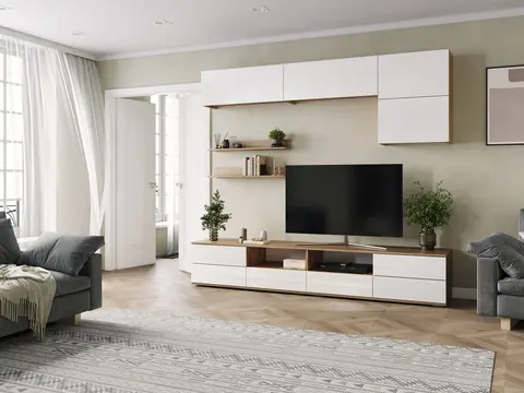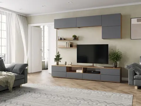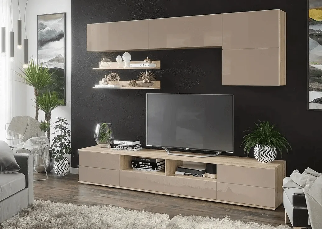 Стильная современная гостиная отлично впишется в любой интерьер вашего дома. Выдвижные ящики, навесные модули удобно открываются и имеют яркую современную расцветку. Платяной шкаф и удобный комод, выполнены в едином стиле. Их можно приобрести дополнительно, чтобы завершить образ вашей гостиной.