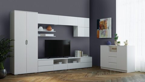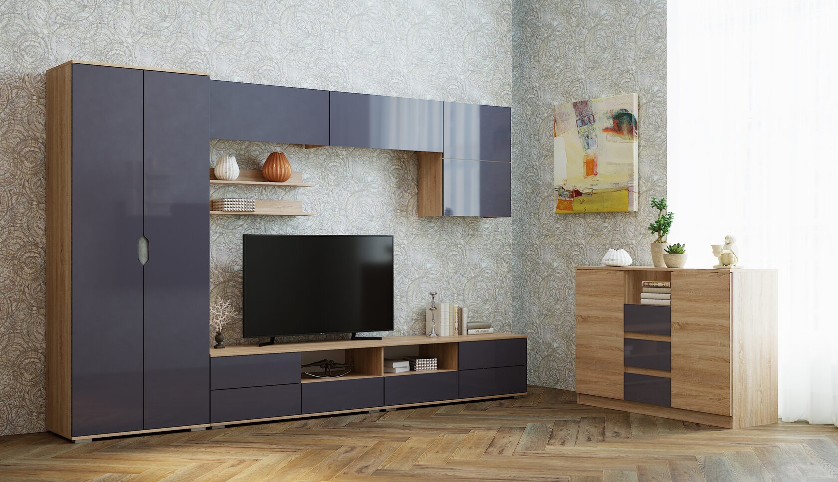Стильная современная гостиная отлично впишется в любой интерьер вашего дома. Выдвижные ящики, навесные модули удобно открываются и имеют яркую современную расцветку. Платяной шкаф и удобный комод, выполнены в едином стиле. Их можно приобрести дополнительно, чтобы завершить образ вашей гостиной.