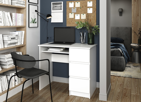 Стол оснащен выдвижной полкой на роликовых направляющих для удобного использования и хранения клавиатуры. Справа или слева может располагаться тумба (звисит от выбора исполнения стола) с выдвижными ящиками. На фасадах ящиков отсутствуют ручки, функцию ручек выполняет сам фасад (его верхняя часть с внутренней стороны прямая под углом 90°).