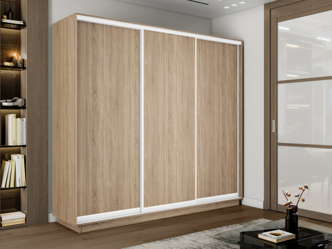 Фасады дверей можно выбрать. Толщина ДСП корпуса — 16 мм. Это оптимальная толщина ДСП. Шкаф получается прочным, при этом система направляющих и ролики не изнашиваются от избыточной тяжести. Используется ДСП австрийского производителя Egger. Ударостойкая кромка ПВХ защищает торцы шкафа от сколов и повреждений. Алюминиевый профиль обеспечивает плавный ход дверей и продлевает срок службы шкафа. Задняя стенка исполнена из плиты HDF, которая не прогнется со временем. Отдельный цоколь позволяет поставить шкаф вплотную к стене. Безопасные стекла и зеркала не осыпаются даже при сильном ударе благодаря противо осколочной пленке.