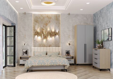 Состав: Шкаф 900мм; Комод 900мм; Кровать с настилом ЛДСП 1400мм; Тумба прикроватная 500мм-2шт.